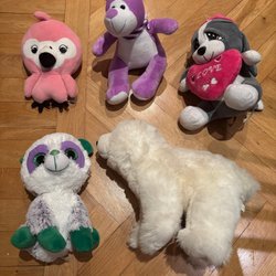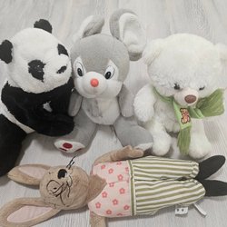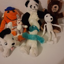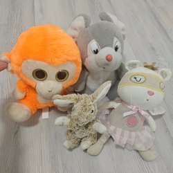 Ett set med blandade gosedjur. Inkluderar en grå mus, en orange bläckfisk och två emoji-kuddar.