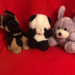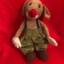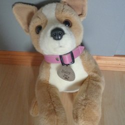 Söt mjukishund som gärna vill ha ett nytt hem. Den har en knapp där det står 'Press here' och då skäller hunden. Behöver ev byta batteri