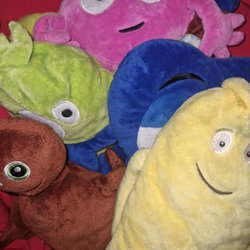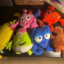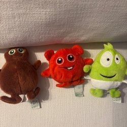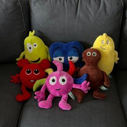 Ett set med Babblarna gosedjur i varierande skick. Stora Bobbo är i riktigt fint skick medan de andra är i använt skick. Det förekommer fläckar på Dadda och behöver tvättas, se bild 4.