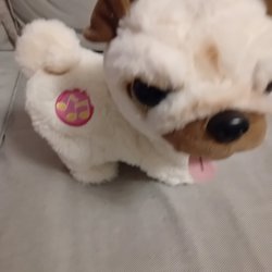 Söt mjukdjur i form av en hund. Den har ljusbrun päls med mörkbruna öron och nos. Perfekt som gosedjur eller dekoration.