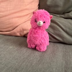 Två söta gosedjur. Den ena är en grå hund med ett grönt horn och den andra är en lila och vit hamster.