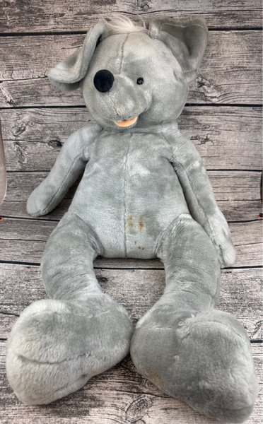 Ett grått mus gosedjur. Den har en svart nos och hängande öron. Observera fläckar på magen.