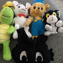 Vändbart gosedjur. Den ena sidan är rund och lila/vit. Den andra är en lila katt med ett silverfärgat horn.