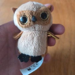 Mjukdjur i form av en uggla. Ugglan har en brun ovandel och en orange underdel med gråa prickar. Den har stora vita ögon med bruna pupiller.
