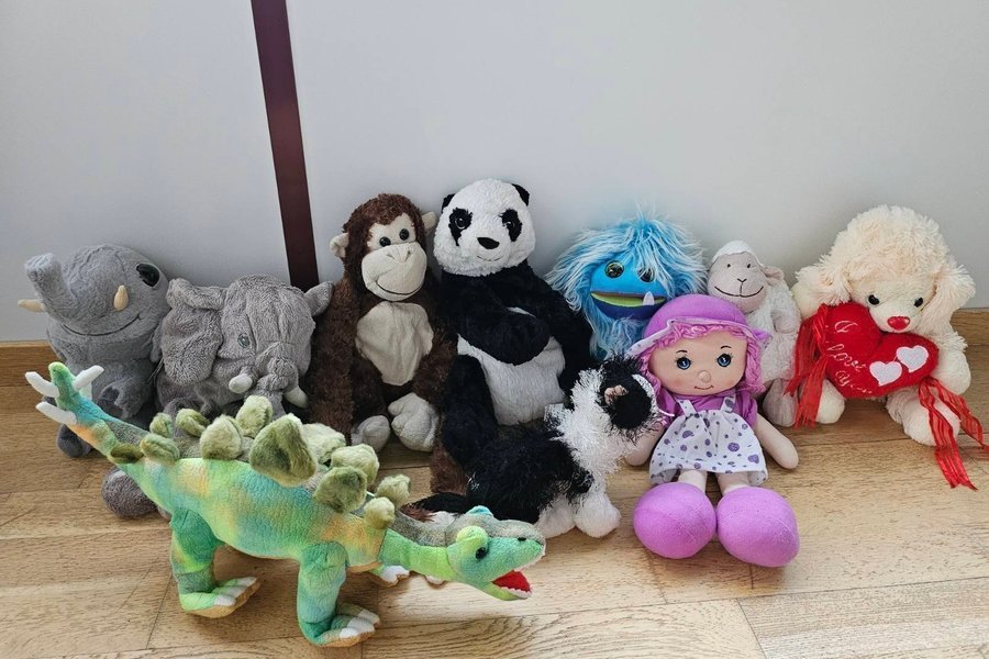 Ett sortiment av mjuka och kramgoa gosedjur. Perfekt för barn eller samlare. Inkluderar bland annat elefanter, en apa, en panda, ett monster, ett får, en hund med ett hjärta, en docka och en dinosaurie. 10 st