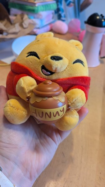 Gosedjur föreställande Nalle Puh i röd tröja, hållandes en honungsburk med texten "HUNNY" på. Nalle Puh har ett glatt ansiktsuttryck.