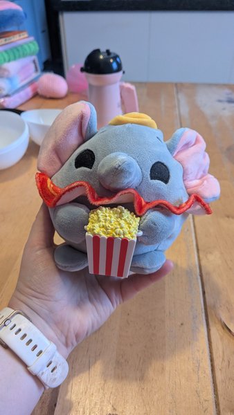 Mjukdjur föreställande Dumbo, den flygande elefanten från Disney. Dumbo håller i en liten popcornbägare. Mjukdjuret är grått med rosa öron och en gul hatt.