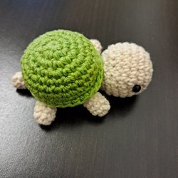 Virkad sköldpadda i blått och turkost garn. Sköldpaddan har en mjuk textur och svarta ögon. Kan göras i flera färger