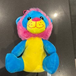 Mjukdjur i form av ett lejon. Lejonet har en man i fuskpäls och broderade ögon. Färgen är beige och brun. Finns två mindre fläckar på ena benet (se bild 3). Har inte testat att tvätta.