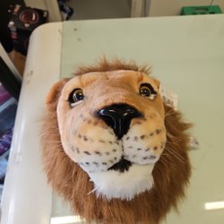 Denne pude er formet som et tigerhoved og har et realistisk tigerprint. Den er lavet af blødt materiale og har en flad bagside.