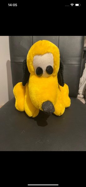Mjukdjur föreställande Pluto, Musse Piggs hund. Den är gul med svarta öron och nos. Ögonen är svarta knappar.
