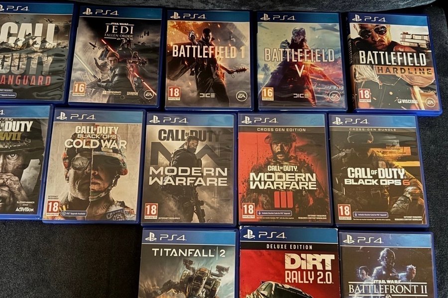 Säljer en samling av PS4-spel. Inkluderar titlar som Call of Duty, Battlefield, Star Wars Jedi Fallen Order, Titanfall 2 och Dirt Rally 2.0.
