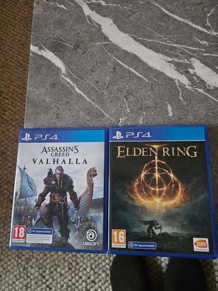 Säljer två PS4-spel: Assassin's Creed Valhalla och Elden Ring.