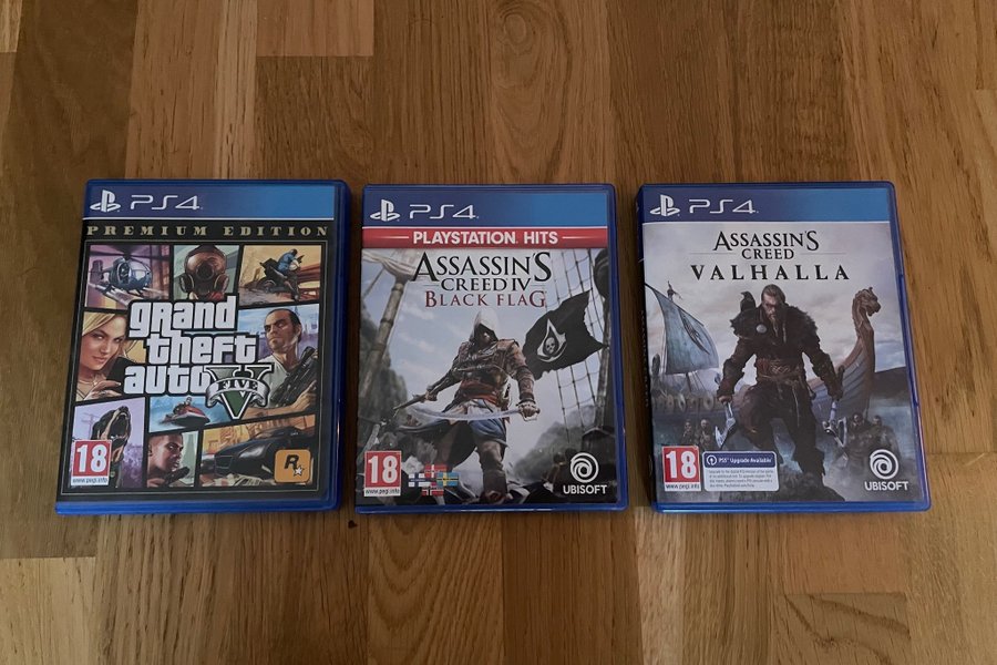 Tre spel till Playstation 4: Grand Theft Auto V Premium Edition, Assassin's Creed IV Black Flag (Playstation Hits) och Assassin's Creed Valhalla.