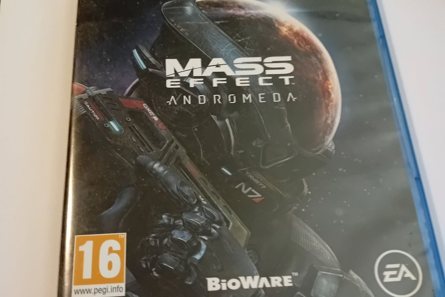 Mass Effect Andromeda till PS4. Spelet är utvecklat av BioWare och publicerat av EA. PEGI-åldersgränsen är 16.