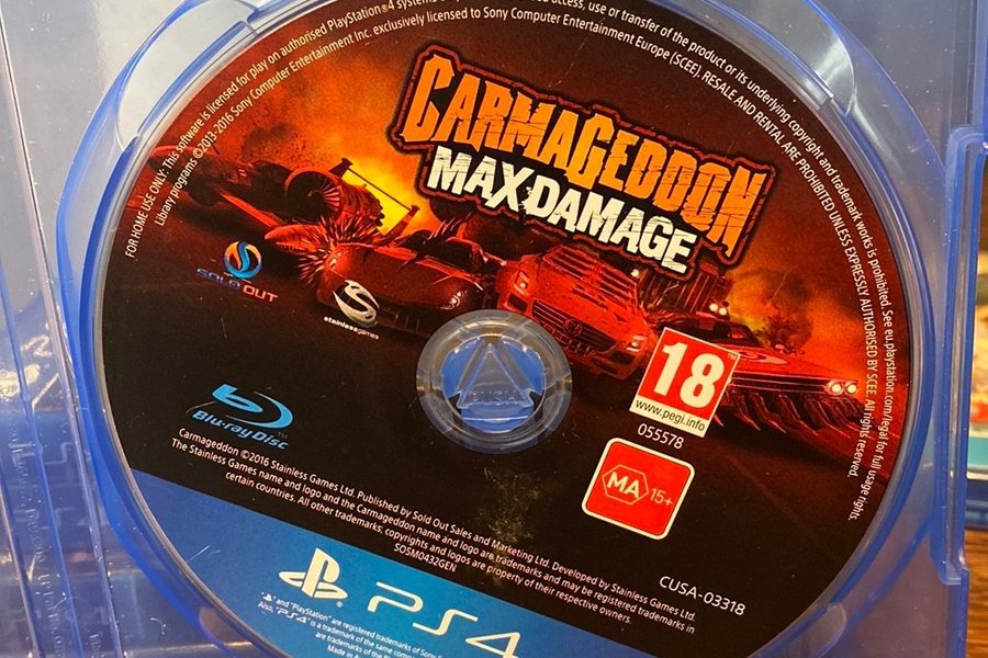 Spelet är Carmageddon Max Damage till PS4. Spelet är utvecklat av Stainless Games Ltd. och publicerat av Sold Out Sales and Marketing Ltd.