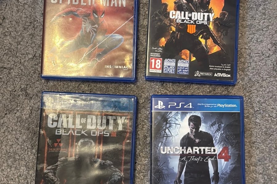 Paket med fyra PlayStation 4-spel. Ej testade. Innehåller Marvel Spider-Man, Call of Duty Black Ops 4, Call of Duty Black Ops 3 och Uncharted 4: A Thief's End.