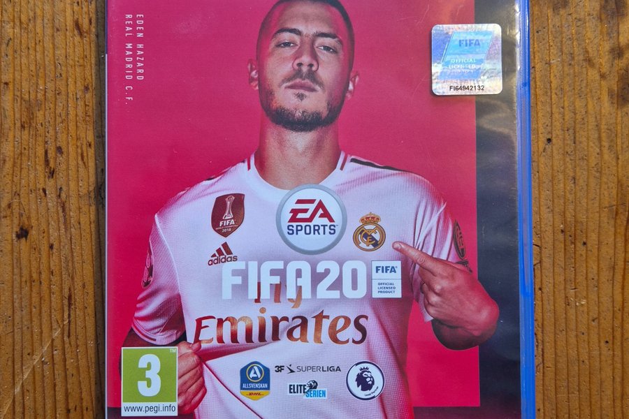 Säljer FIFA 20 till PlayStation 4. Spelet har Eden Hazard från Real Madrid C.F. på omslaget. Spelet är märkt med PEGI 3.