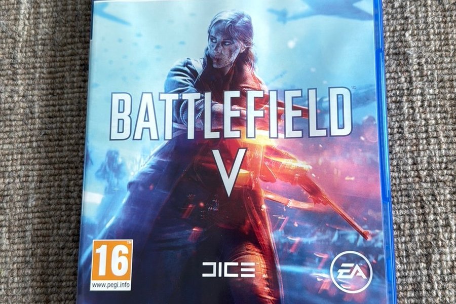 Battlefield V till PS4. Spelet är utvecklat av DICE och publicerat av EA. Åldersgränsen är 16 år enligt PEGI.