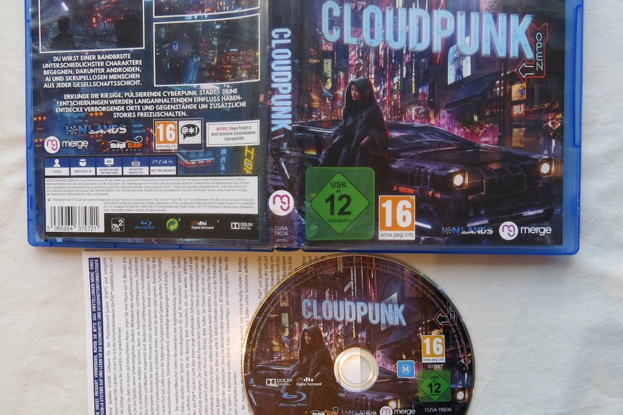 Cloudpunk för PS4. Spelet är utvecklat av ION LANDS och Stage Clear Studios, och publicerades av Merge Games. Spelet har stöd för 1 spelare och kräver minst 6 GB lagringsutrymme. Det har HD-videoutgång med upplösningarna 720p, 1080i och 1080p. Spelet stöder fjärrspel och är PS4 Pro Enhanced. Åldersgränsen är USK 12 och PEGI 16.
