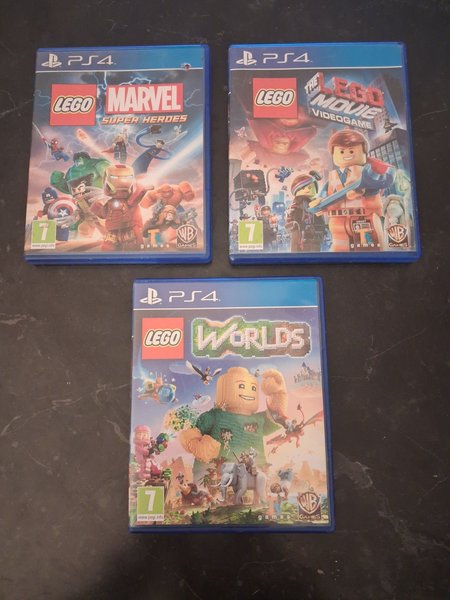 Sælger en pakke med tre Lego spil til PlayStation 4. Pakken inkluderer "Lego Marvel Super Heroes", "The Lego Movie Videogame" og "Lego Worlds".