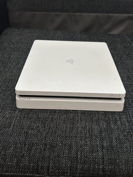 Konsolen är av modellen PlayStation 4. Den är vit och har Sony-logotypen samt PS4-märkningen synlig på framsidan.