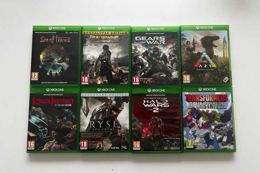 Säljer en samling Xbox One-spel. Inkluderar titlar som Sea of Thieves, Dead Rising 3 Apocalypse Edition, Gears of War 4, Ark Survival Evolved, Killer Instinct Definitive Edition, Ryse Son of Rome Legendary Edition, Halo Wars 2 Ultimate Edition och Transformers Devastation.