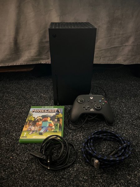 Säljer Xbox Series X med en wired handkontroll, Minecraft och kablar. Allt är i mycket fint skick