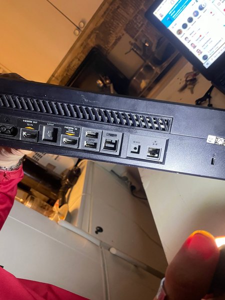 Xbox konsol med portar för HDMI ut, S/PDIF, HDMI in, USB, IR ut och nätverkskabel.