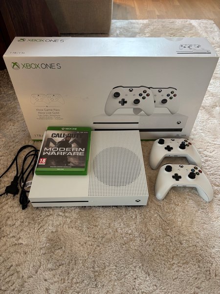 Xbox One S med två handkontroller och spelet Call of Duty Modern Warfare.