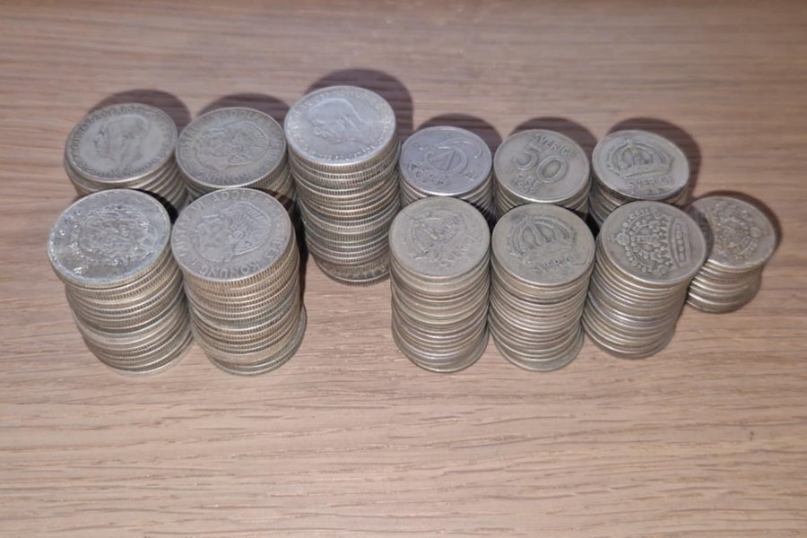 - 103 stycken 1-kronorsmynt i silver (40% silverhalt), präglade 1942–1968 (Gustaf V och Gustaf VI Adolf).