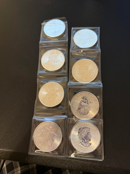 Samling av silvermynt. Inkluderar mynt från Canada. Ett av mynten har värdet 5 dollar och är från 2024
