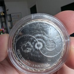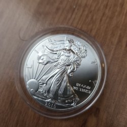 Ett silvermynt från USA. Myntet har texten "1 OZ FINE SILVER - ONE DOLLAR". Från 1997