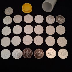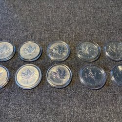 Dessa två kanadensiska lönnlöv i silver är från 2011 och har ett värde av 5 dollar vardera. De är präglade med drottning Elizabeth II på ena sidan och det ikoniska lönnlövet på den andra.