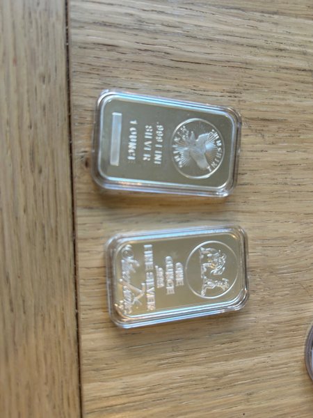Två silverstackar, 1 troy ounce vardera. Den ena är från Sunshine Minting och den andra från Royal Mint.