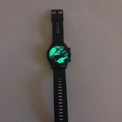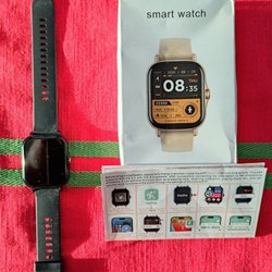 Snygg smartklocka med svart armband och ett extra beiget armband. Laddare och manual ingår.