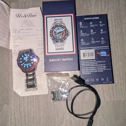 Smartklocka i svart. Den har en digital display med olika appar, internetuppkoppling, bluetooth, kamera på framsidan och plats för SIM kort och möjlighet till direktsamtal och sms. Klockan har en svart silikonrem och levereras med en laddkabel. Fungerar som den ska. Ca 3,5x4,5 cm.