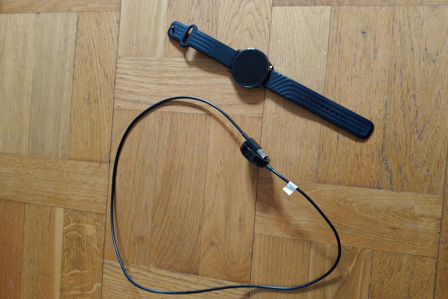 There are some scratches on the face and visible wear but otherwise working fine. Charging cable included.