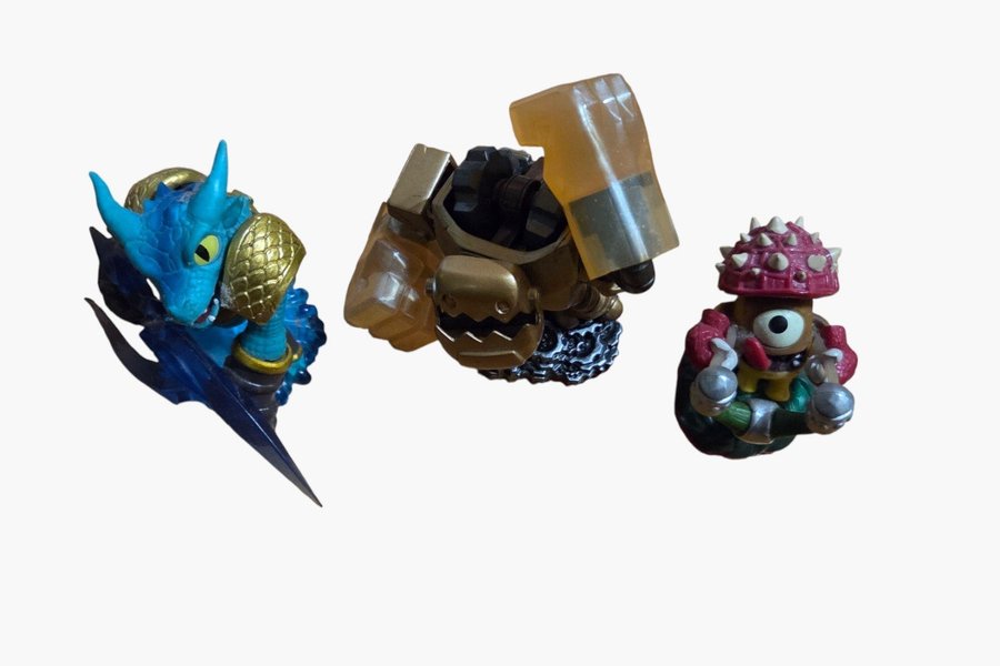 Detta paket innehåller tre Skylanders-figurer: en blå drake, en guldfärgad figur med transparenta delar och en brun figur med röd hatt och ett öga.