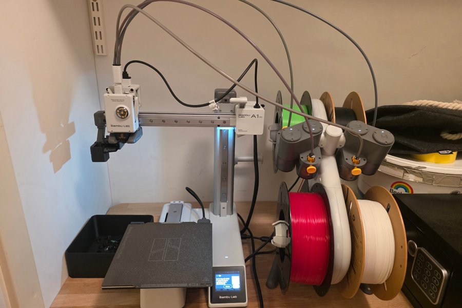 Hej säljer min bambu lab a1 mini med ams lite då jag inte använder den så mycket. Det medföljer ungefär 10 kilo med pla. Fem stycken som är öppande och sen 8 st oöppnade i olika färger