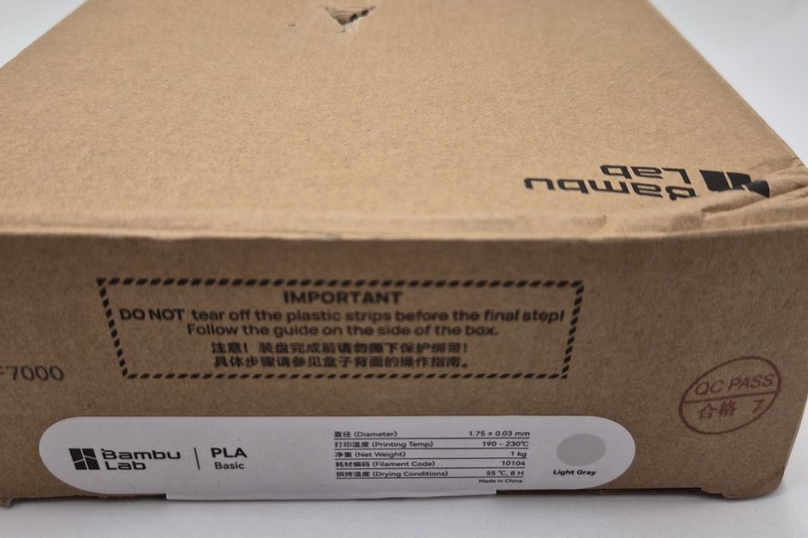 Bambu Lab PLA Basic filament i färgen ljusgrå. Diametern är 1.75 ± 0.03 mm. Rekommenderad utskriftstemperatur är 190-230°C. Nettovikt är 1 kg. Filamentkoden är 10104. Rekommenderade torkningsförhållanden är 55°C i 8 timmar. Tillverkad i Kina.
