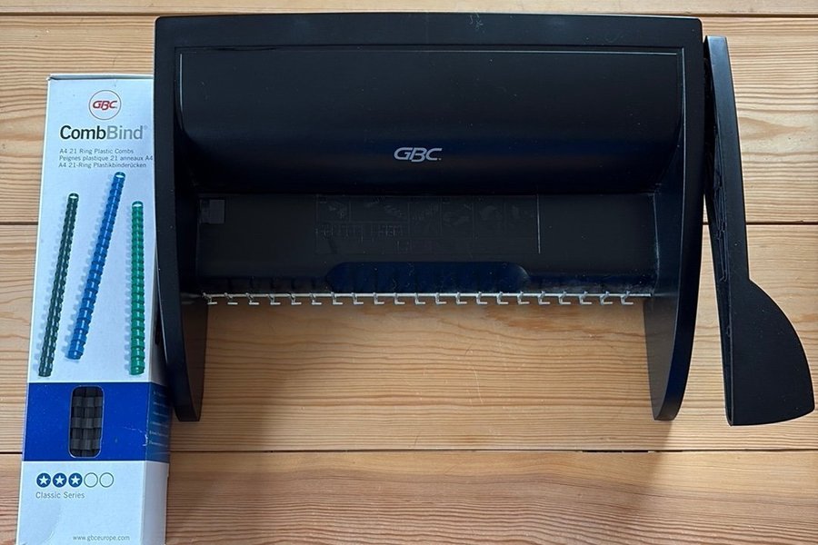 GBC CombBind manuell inbindningsmaskin för A4-dokument. Maskinen använder 21-rings plastkammar för inbindning. 21 stycken GBC A4 21-rings plastkammar medföljer.
