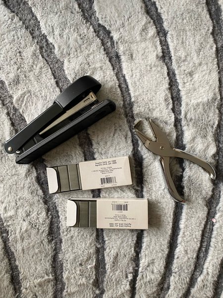 Säljer en svart häftapparat tillsammans med en häftborttagare i metall och två askar med häftklamrar.