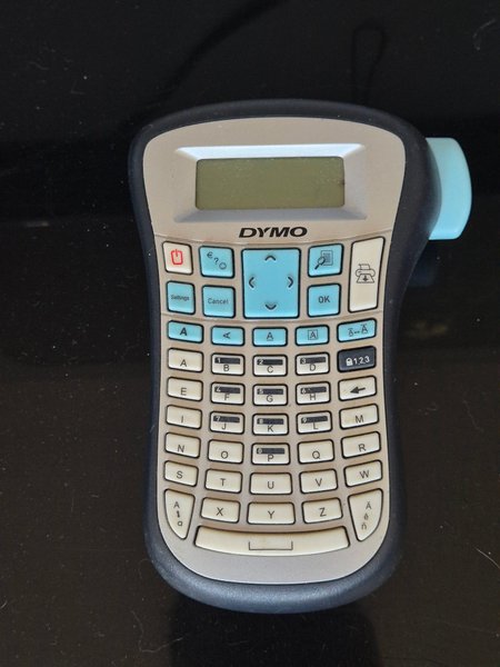 Märkmaskin från DYMO. Modellen har en QWERTY-tangentbordslayout och en monokrom skärm. Drivs med batterier.