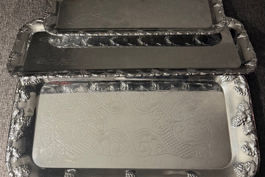 Set med tre serveringsbrickor i silverfärg. Brickorna har en rektangulär form med rundade hörn och dekorativa kanter med druvklasar och löv. Ytan är graverad med ett mönster av snirkliga rankor och rutnät.