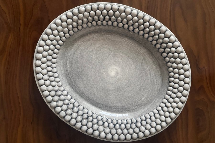 Serveringsfat i keramik med en oval form från Mateus serien Bubbles i färgen Grå. Har använts mycket sparsamt. Nypris 995kr.