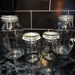 Fina förvaringsburkar för tex ris pasta socker osv 4 st i olika storlekar med lock, man kan ta av den svarta delen och tvätta för hand men också u diskmaskin om man vill det. Mycket fint skick