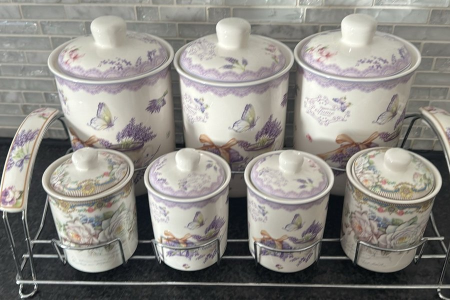 Kryddställ med sex burkar. Tre större burkar och tre mindre burkar. Burkarna har lock och är dekorerade med fjärilar och blommor i lila och rosa nyanser.porslin