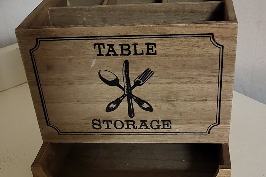 Bestickförvaring i trä med texten "TABLE STORAGE" och bestickmotiv. Förvaringen har flera fack för sortering av bestick och en låda undertill.