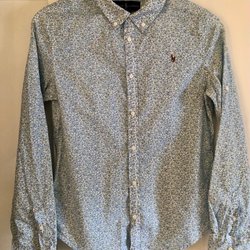 En fin kanna med blått blommönster och gulddetaljer.